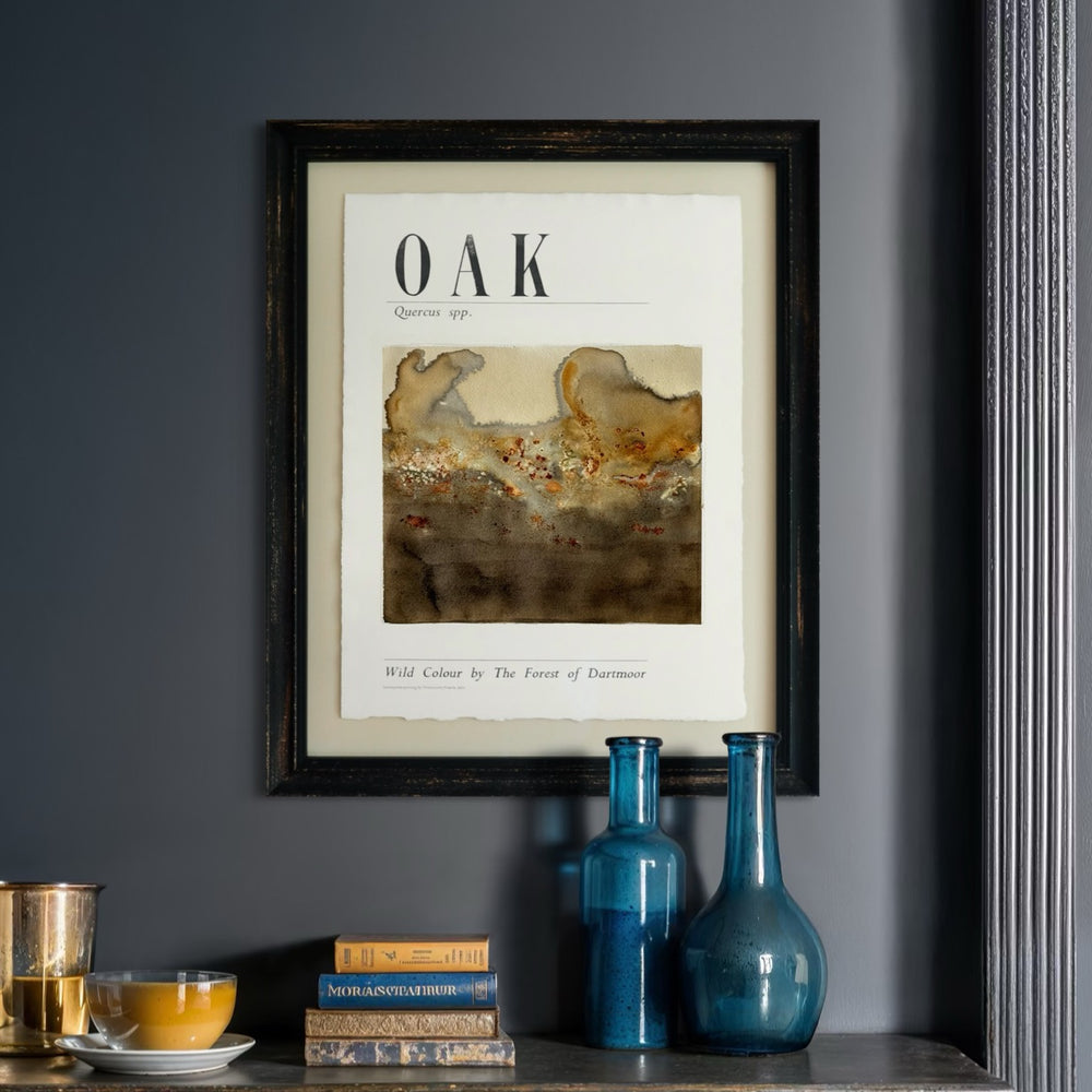 Oak gall ink has been used as official record keeping ink for hundreds of years due to its permanence. We anticipate the botanical ink will change over time. Every precaution has been taken to slow this inevitable change, including pretreating the paper, and using UV-protective art glass for the framing. Still, we encourage you to take a photo of the work every year on its anniversary so that you can record its progression over time. The letterpress ink is a custom blend from British ink makers, Hawthorn, and rated above 5 on the Blue Wool Scale and rated at the level needed for artists.
