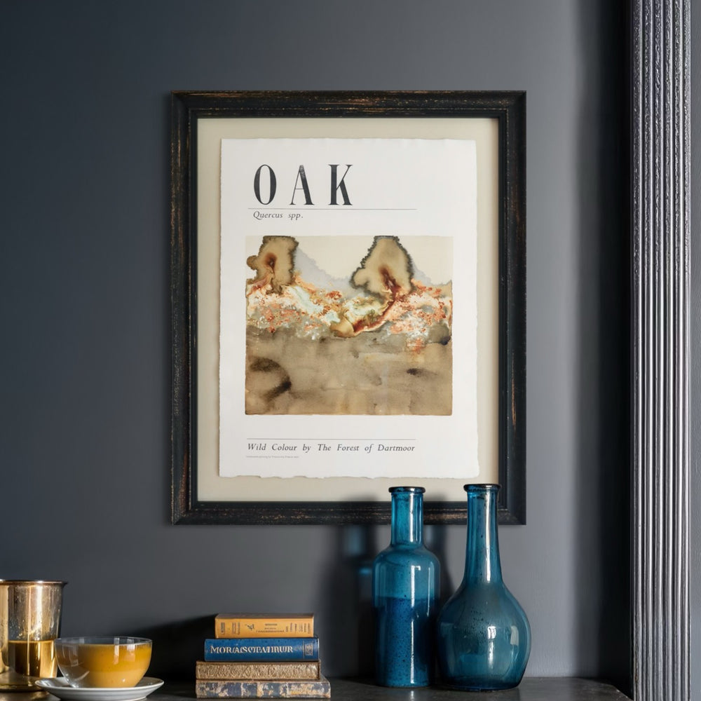 Oak gall ink has been used as official record keeping ink for hundreds of years due to its permanence. We anticipate the botanical ink will change over time. Every precaution has been taken to slow this inevitable change, including pretreating the paper, and using UV-protective art glass for the framing. Still, we encourage you to take a photo of the work every year on its anniversary so that you can record its progression over time. The letterpress ink is a custom blend from British ink makers, Hawthorn, and rated above 5 on the Blue Wool Scale and rated at the level needed for artists.